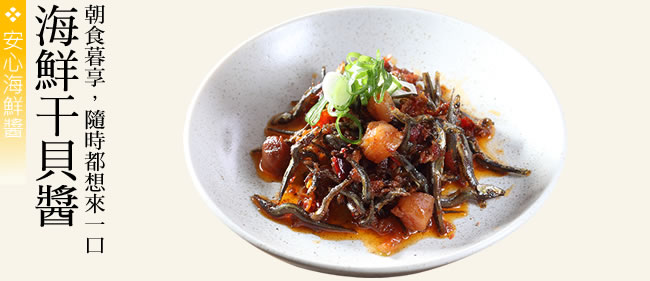 海鮮干貝醬180g*3罐 :大豆油、辣椒、小魚乾、蒜頭、干貝、蘿蔔乾、豆瓣醬【水、非基因改造黃豆、小麥、食鹽、乙醯化己二酸二澱粉、焦糖色素、甜味劑(醋磺內酯鉀)、5’-次黃嘌呤核苷磷酸二鈉(調味劑)、5’-鳥嘌呤核苷磷酸二鈉(調味劑)、香料、香油(大豆油、芝麻油)】、沙茶醬【黃豆油、狗母魚、南薑粉、蒜、小麥麩皮、芝麻粉、味精、蔥干、椰子粉、辣椒粉、蝦、蔥酥(蔥頭、棕櫚油、玉米澱粉) 、香辛料(甘草、茴香、桂枝、丁香) 、 鹽、豆蔻粉、5’-次黃嘌呤核苷磷酸二鈉、5’-鳥嘌呤核苷磷酸二鈉、花椒粉、白胡椒】、蝦米、蠔油【水、糖、鹽、蠔汁、L-麩酸鈉(調味劑)、羥丙基磷酸二澱粉(粘稠劑)、小麥粉、焦糖色素(著色劑)】、香油【大豆油、芝麻油】