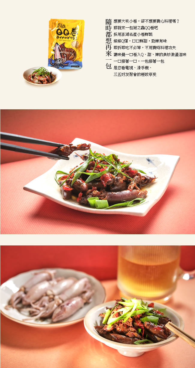 小卷、麥芽糖、味霖(米麴醱酵調味液(水、米、米麴、釀造酒精、釀造酢、鹽)、甘蔗液糖、釀造酢、鹽)、大豆油、辣椒、朝天椒、醬油、蒜頭、醬油粉(釀造醬油、麥芽糊精、鹽、焦糖色素、5'–次黃嘌呤核苷磷酸二鈉、5'–鳥嘌呤核苷磷酸二鈉、大豆油、琥珀酸二鈉、DL-胺基丙酸)、四川調味油(芝麻油、大豆油、青花椒萃取物、大豆卵磷脂、孜然萃取物、葵花油、紅椒萃取物、花椒萃取物、辣椒油抽出物、水、食品添加物(維生素E(抗氧化劑)、香料、中鏈三酸甘油脂、丙二醇、脂肪酸甘油脂))、調味劑(L-麩酸鈉、5'–次黃嘌呤核苷磷酸二鈉、5 '–鳥嘌呤核苷磷酸二鈉、琥珀酸二鈉、胺基乙酸、DL-胺基丙酸)、甜味劑(蔗糖素(甜味劑)、醋磺內酯鉀(甜味劑)、乳糖)